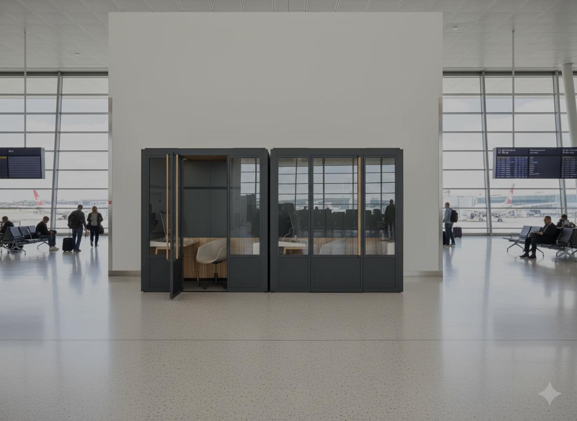 Enjoy a modular, quiet, and private personal workspace designed to offer a functional environment for working or making calls within the bustling airport. Each pod offers power outlets, internet connectivity, lighting, and often an ergonomic desk and chair, providing a convenient solution for business or leisure.